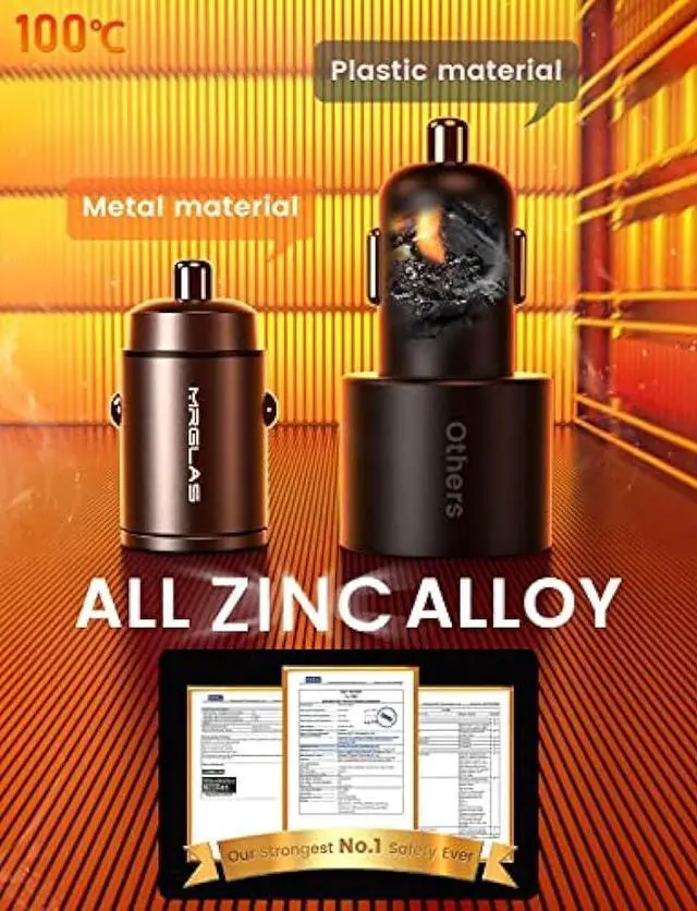 ALL ZINC ALLOY METAL PROTECTION: A all metal well-built body brings a very sleek sturdy feel compared with the usual plastic. Metal Material Provides better heat dissipation, scratch resistance, attractive design. With multiple safety certifications and a built-in smart IC, MRGLAS usb c car charger fast charge can prevent overcurrent, short circuit, over-voltage, under-voltage, over-temperature, and overpower to protect your device.