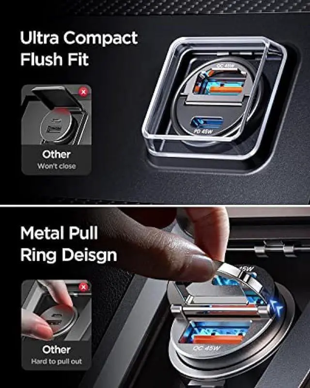 PULL RING DESIGN: The smallest flawlessly car charger on the market until now. With a tiny-sized body, fits snug and flush into the lighter outlet does not protrude which perfectly hides in your cigarette lighters. Never popup while driving and won't block the cover of the cigarette lighter. So we designed a pull-ring to help you unplug from the car cigarette lighter easier.