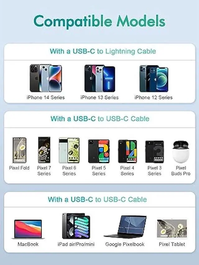 Compatible DevicesGoogle Pixel 7/6/6/5/4; Samsung Galaxy S22/S21/S21 Ultra/S21 Plus/S21 5G/S21 Plus 5G/S21 Ultra 5G/S20/S20 5G/S20 Plus/S20 Plus 5G/S20 Ultra/S20 Ultra 5G/S20 FE/S20 FE 5G/Samsung Galaxy Note 20/Note 20 5G/Note 20 Ultra 5G/Note 10/Note 10 5G/Note 10 Plus/Note 10 Plus 5G/Note 9/Note 8/Galaxy S10/S10e/S10 Plus/S10 5G/S9/S8; iPhone 14/13 Pro/13 Pro Max/13 mini/13/12 Pro/12 Pro Max/12 mini/12/11 Pro/11 Pro Max/11/SE (2nd generation) /XS/XS Max/XR/X/8/8 Plus.