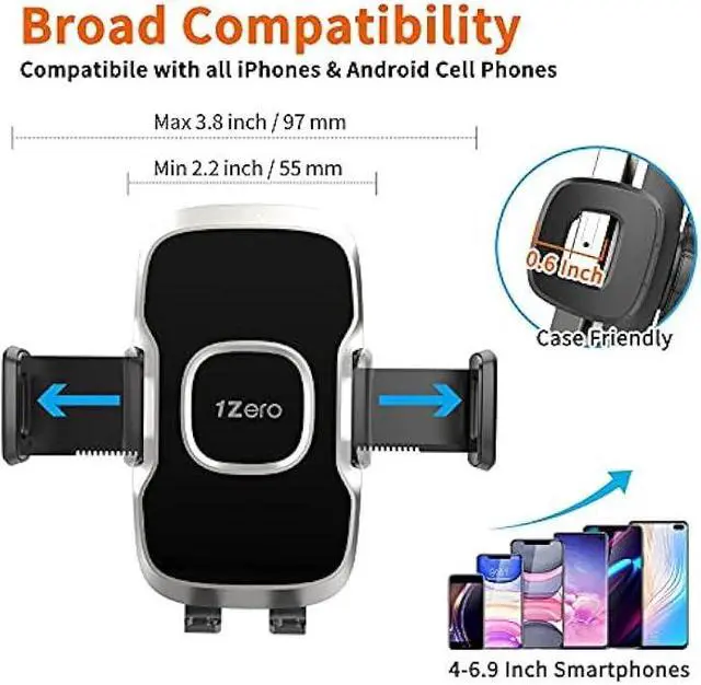 BROAD COMPATIBILITY: The clamp of 1Zero phone car holder can be open to 4 inches, compatible with iPhone 14ProMax 14Pro 14Plus 14 13ProMax 13 Pro 13 13Mini 12ProMax 12Pro 12 12Mini 11ProMax 11Pro 11 XS XR SE (2020) X SE 10 8 Plus 7, Cellphone car holder mount for Samsung Galaxy S23 Ultra S23+ S22 Ultra S22+ S22 S21+ S21 S20 FE S20+ S10 S10+ S10E S9 S9+ A91 A90 A80 A72 A71 A70 A60 A52S A52 A51 A50 A42 A41 A40 A31 A30 A21 A20 A10, Windshield phone mount for Google Pixel 7Pro 7 6Pro 6 6a 5a 5, etc.
