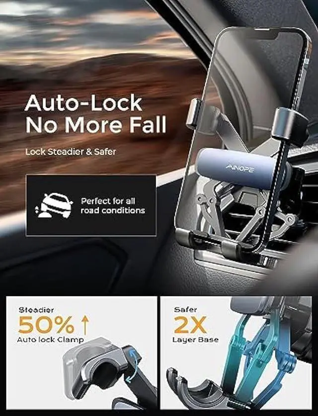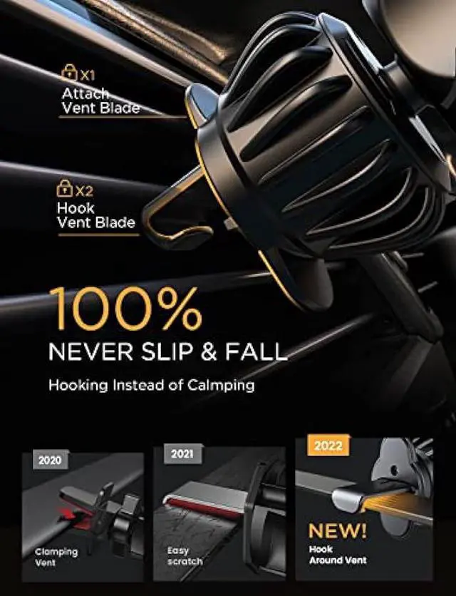 UPGRADED AIR VENT HOOK: This car vent phone holder mount is designed as Hook shape and form Three grasp points which can firmly hook around the a/c vent for no slippage or movement. It solving the market's common problem of falling forward and off the air vent constantly when going over bumps or turns.