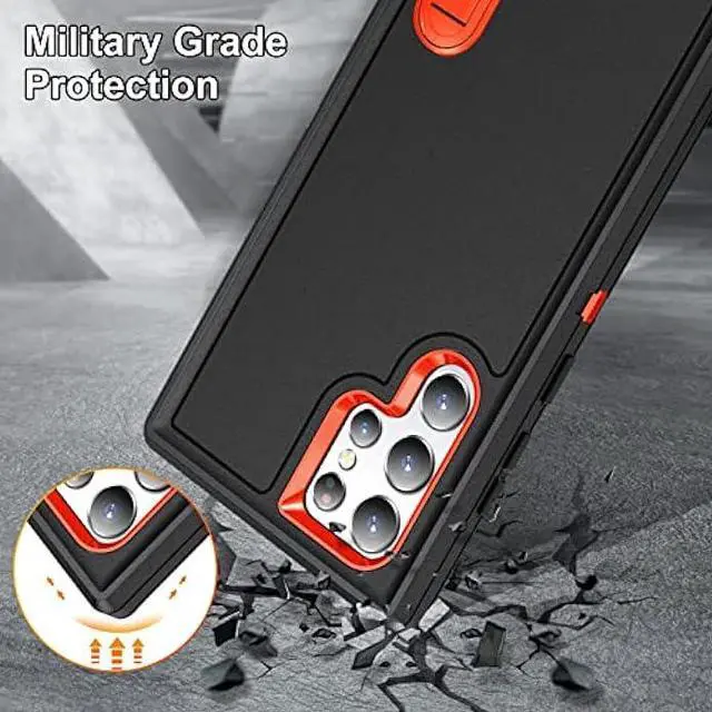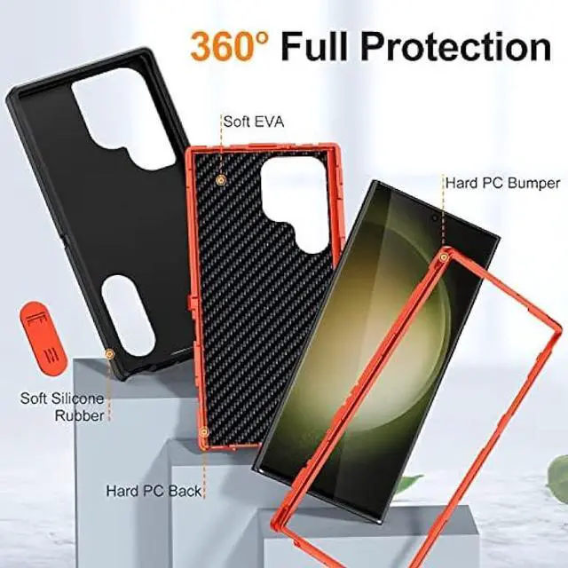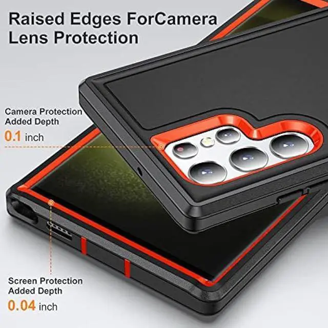 [Full Body Protection]: This three-in-one combination of military grade tough protection S23 Ultra 5G Case, Hard PC + Solid inner polycarbonate shell soft cushioning rubber outer S23 Ultra Protection cover, Four-corner grooved airbags, unique shock absorption design, more comprehensive protection of the fragile parts for the smartphone. Raised lips keeps camera lifted to prevent your lens from shock, collision and scratch. Dust Protection port plugs lock out dust, dirt so your device stays clean and debris free