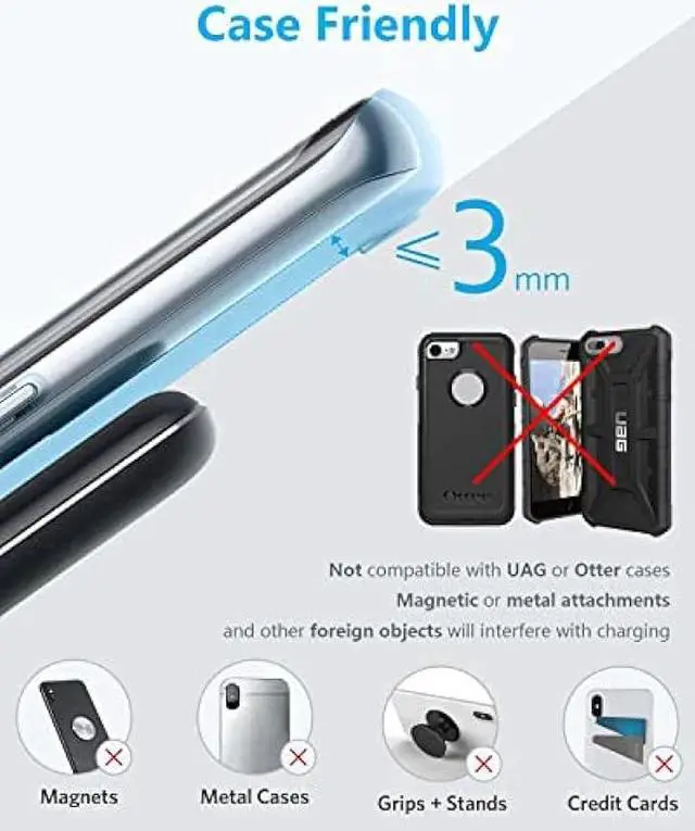 Qi Charging Pad for iPhone & Android Cellphones - Work flawlessly with normal or quick charge speed: 15W for LG G7 G7+ G8 G8S G8X V30 V30+ V30S V35 V50 V50S V40 ThinQ / Samsung Galaxy S23 S21 S20 S20+ Note 21 20 10+ (5G), 10W for S10 S10+ S9 S9+ S8+ S8 Active S7 edge S6 edge+, Note 10 9 8 7, Sony Xperia Xz2 Xz3 Xz4, MOTO Z, Nokia 8 Sirocco & 9 Pureview etc. 7.5W for iPhone 14 13 12 mini 11 X XS XR & Pro Max / 8 & plus so far; 5W for any Qi cordless charging enabled smart phones.