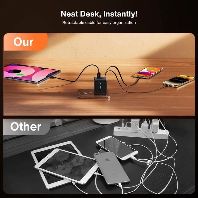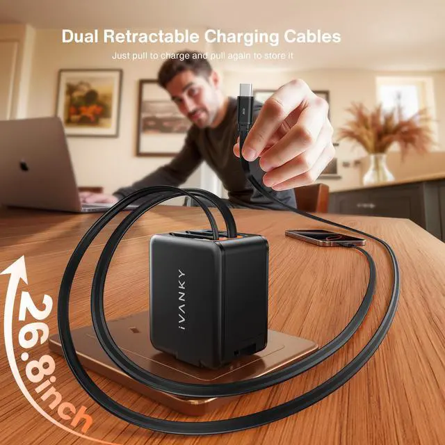 Retractable & Tangle-Free DesignEquipped with built-in 26.8 -inch retractable Type-C and Lightning Cables, this charger eliminates cable clutter. Simply pull to extend and release to retract, keeping your workspace neat