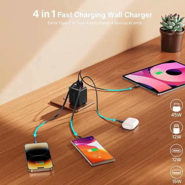 Simultaneous 4-Device ChargingWith four ports (45W+15W USB-C, 12W USB-C/A), it powers up phones, tablets, watches, and laptops at once, ideal for multi-device users