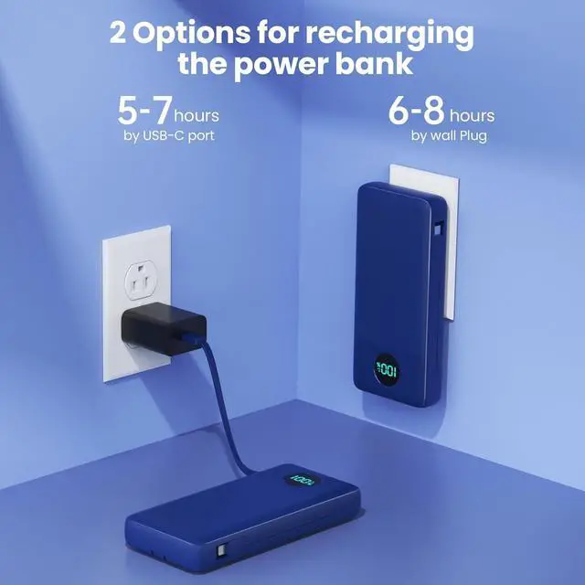 Wall Plug: There are two ways to charge this battery pack charger portable one is recharging itself directly through AC wall plug(100-240V) which can fully recharge within 7-10 hours; The other is using Type-C Cable input which can fully recharge within 6-8 hours. While the adapter charges your phone it also charges the battery inside.