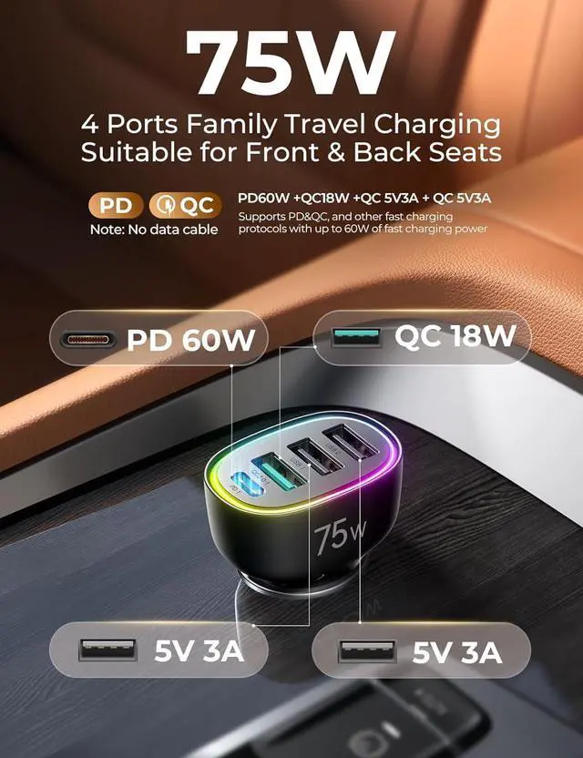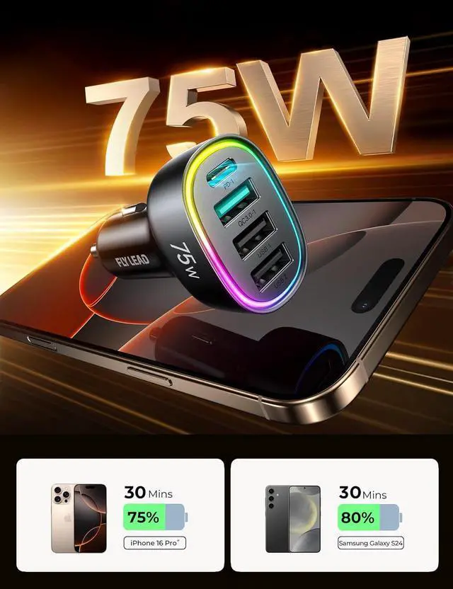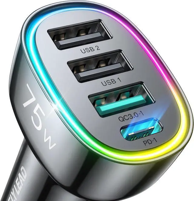 75W 4-Port Car Charger Adapter | Fast Charge 4 Devices Simultaneously Charge Faster, Smarter: FLYLEAD car charger powers 3 USB-A + 1 USB C car charger ports, delivering fast charger speeds for phones, tablets, and more. Perfect for road trips or daily commutesno more backseat battles over charging ports!