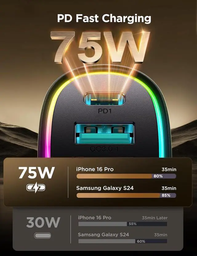Rapid Charging for All Devices Upgrade Your Ride: This cigarette lighter USB charger combines PD 3.0 (60W) + QC 3.0 (18W) tech. Charge iPhone 16 to 89% in 40 mins. Your ultimate fast charger for the road