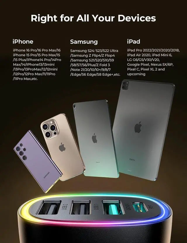 Universal Car Charger | Fits All 12V-24V Vehicles & Devices Compatibility Made Simple: compatible with iPhone 16/15/14/13/12 Series, iPad Pro/Air/mini Series, Samsung S25/S24/S23, Google Pixel 8/7/6, and all USB-C devices. Plug into any car cigarette lighter socketfront or back seat, its your go-to car power hub