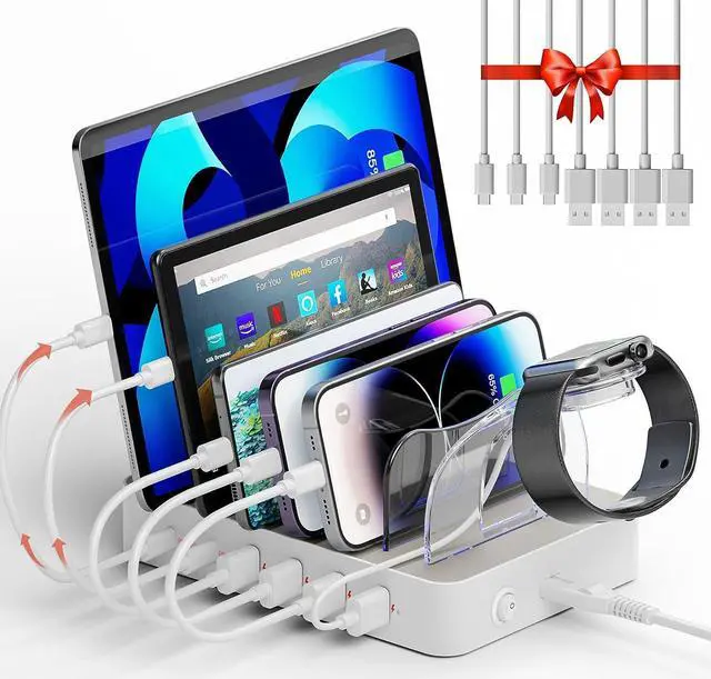 WHAT YOU GET: 1 X Device Charging Station, 1 X Power Cord, 7 X Clear Divider, 1 X Stand for iWatch, 7 x Mixed Short Charging Cable(2*A-iPhone, 1*A-Micro USB, 1*A-Type C, 2*C-C, 1*C-iPhone), 24h friendly customer service and email support.