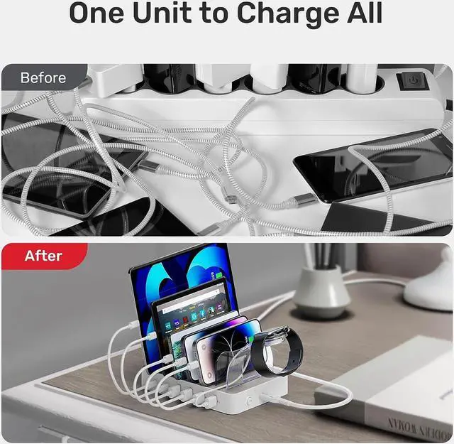 WIDE COMPATIBILITY: Equipped with a built-in smart chip, this charging station organizer can accommodate various devices used by your entire family. It works with iPhone 14/13/12/11/X/8/7 series, iPad Pro/Mini, Samsung Galaxy/Note series, Huawei, Xiaomi, and many more devices. Keeping your desktop clean and clutter-free.