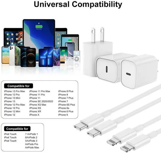 Strong CompatibilityOriginal 10 ft iPhone USB C to lightning cable with PD 20W USB C wall charger to fast charging for iPhone 14/14 Pro Max/iPhone 13/13 Mini/13 Pro/13 Pro Max/12/12 Mini/12 Pro/12 Pro Max/SE 2020/11/11 Pro/11 Pro Max/XS/XS Max/XR/X/8/8Plus/iPad. The 20w usb c fast charger also charges for iPhone 7/7 Plus/6/6 Plus/5/5c/5s/SE at an original charging speed.