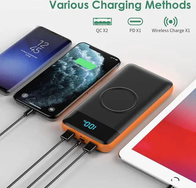 Simultaneous Charging + Smart LED Indictators: Get a 15W wireless charge for your wireless cellphones while charging another device via one of two micro usb outport (QC 4.0 + 2.1A ) or usb-c 25W PD port. The LED battery level indicator show the remaining battery level. You will know when this power bank need be charged.