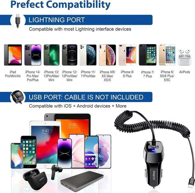 UNIVERSAL COMPATIBILITY: Compatibility with iPhone 14/13/12/11 Mini/Pro/Pro max/Plus/XR/X/XS/XS Max/SE/8/8 Plus/7/7 Plus/6/6S/6 Plus/5/5S/5C, iPad Air/Mini. Additional USB port can charger any other USB-powered devices including Samsung Galaxy, Note, Nexus, HTC, Sony, LG, tablet, power bank and more. It also fits for all vehicle types including cars, vans and trucks (12-24V).