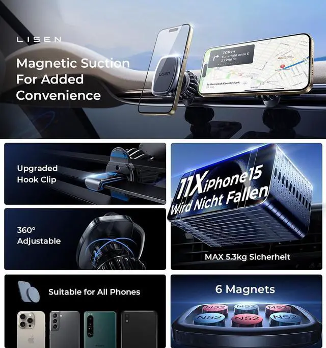 OFFICIAL CERTIFIED& WIDELY COMPATIBLE: LISEN Car Phone Holder is officially certified by SGS RoHS and SGS CP65, and has passed tests for magnetism, phone signal, hook stability and ingredient safety. The quality-controlled car mount is compatible with the following devices: iPhone 16 15 14 13 12 11 pro max / XR / X / 8/7/6/5, Note 9 / Galaxy Note20 S24 S23 S22 U, iPad Air 2 / Mini, and other smart phones and Mini Tablet 3 / Pro 9.7 and above.