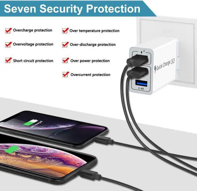 Multile Protection, The QC 3.0 multiple USB charger features Over-Voltage Protection, Over-Current Protection, Over-Heat Protection, Short-Circuit Protection. Safeguard your mobile devices all the time.