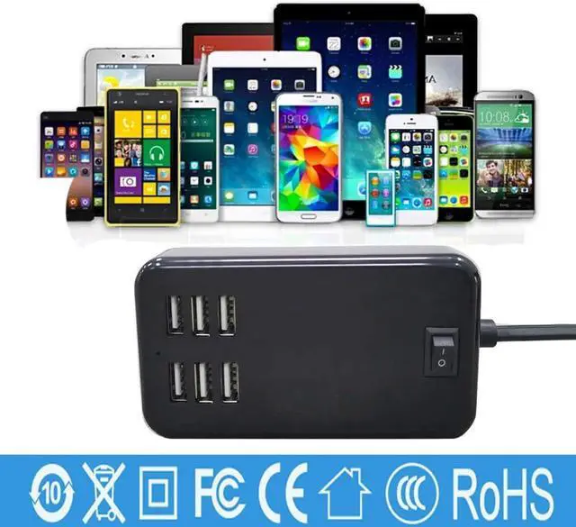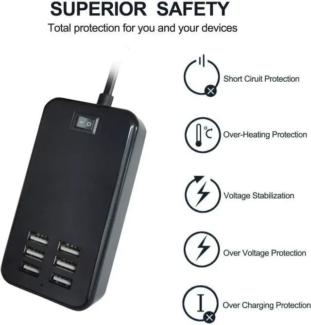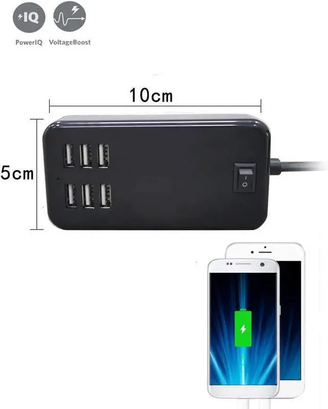 [Multi-port charger]: USB travel charger sync cable for charging, and compatible with most USB-enabled devices. Multi-port charger adopts IC smart solution, output 6USB, stable output DC 5V, 5000mA (5000mA after working temperature rise)