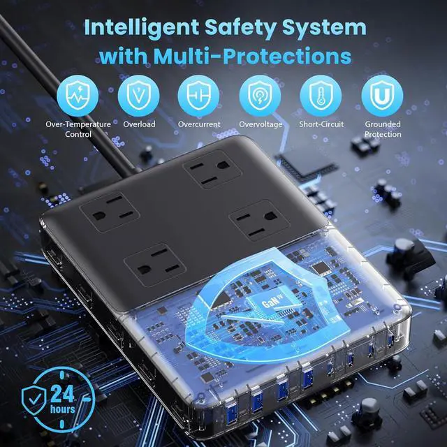 Features 200W Super Fast Charging Station, 12-in-1 Flat Plug Power Strip with Extension Cord, 12 Ports (4 AC Power Outlets + 4 USB-C + 4 USB-A) Multi-Port USB-C Charger, USB Wall Outlet, Multi-Plug Outlet Expander, GaN IV Technology Chip with Multi-Layer Safety Protection 200W Super Fast Charging Station, 12-in-1 flat plug power board with extension cord, 12 ports (4 AC power outlets + 4 USB-C + 4 USB-A), multi-port USB-C charger block, USB wall socket, multi-plug socket extension adapter