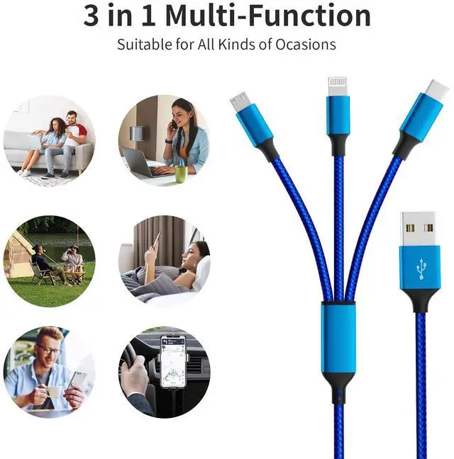 Durability Nylon Braided Cable: Superior Nylon Braided and Aluminum Alloy make this 3 way charger more durability tough bending resistant and pull-resistant. Ensure a longer service life.