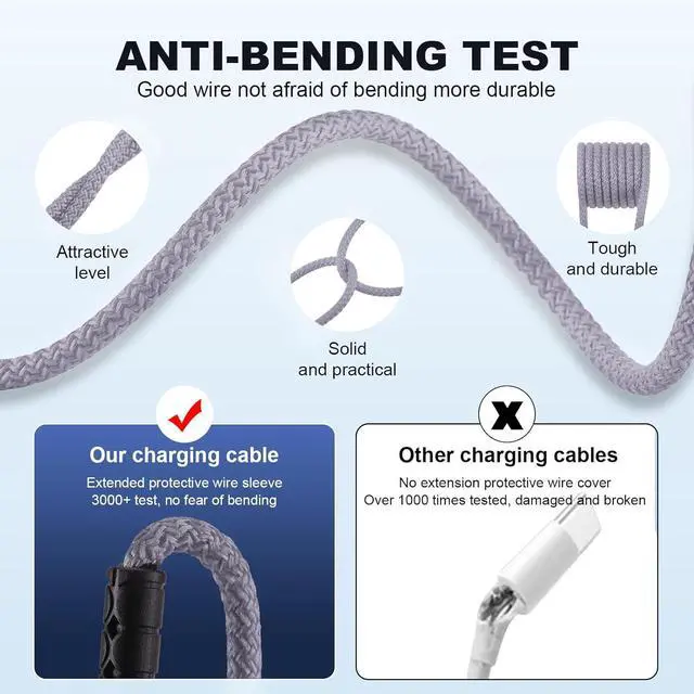 Dur-enhanced Durability: The strong fiber, the softest, strong and durable material, increases the tensile force by 200%. Can withstand 10, 000+ bending tests. The high-quality aluminum shell makes the cable more durable, and the nylon braided type c charging cable increases the durability without tangling.