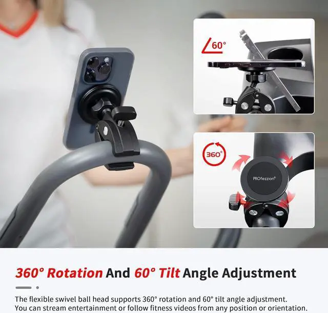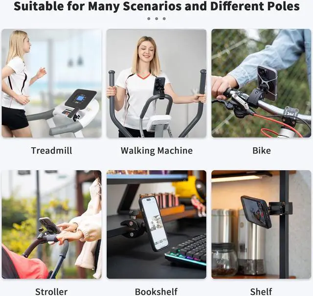 Universal Fit: Securely mount your smartphone on the treadmill, exercise bike, rowing machine, bicycle, motorcycle, desk, stroller, shopping cart, golf cart or scooter with tubular handlebars. Phone holder suitable for mobile phone or phone case with MagSafe, non-MagSafe phone or phone case by using the included metal ring. Fits most tubular handlebars or equipment poles with an outer diameter between 0.6 - 1.8 "