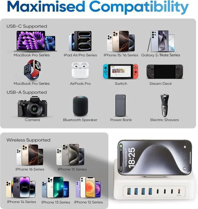 11-in-1 USB Charging Station for Multiple DevicesUSB Charging Hub features 2AC outlets 8 USB ports (4 USB-C 4 USB-A) and a foldable wireless charger in a power station that can charge up to 11 electric devices. PD65W Fast Charging Laptop ChargerThe 65W USB-C port provides fast charging for high-demand devices such as a MacBook Pro effectively charging up to 50% in just 35 minutes. 15W Max Foldable Wireless ChargerCharges up to 2x faster than the previous generation wireless charger compatible with most wireless charging phones.