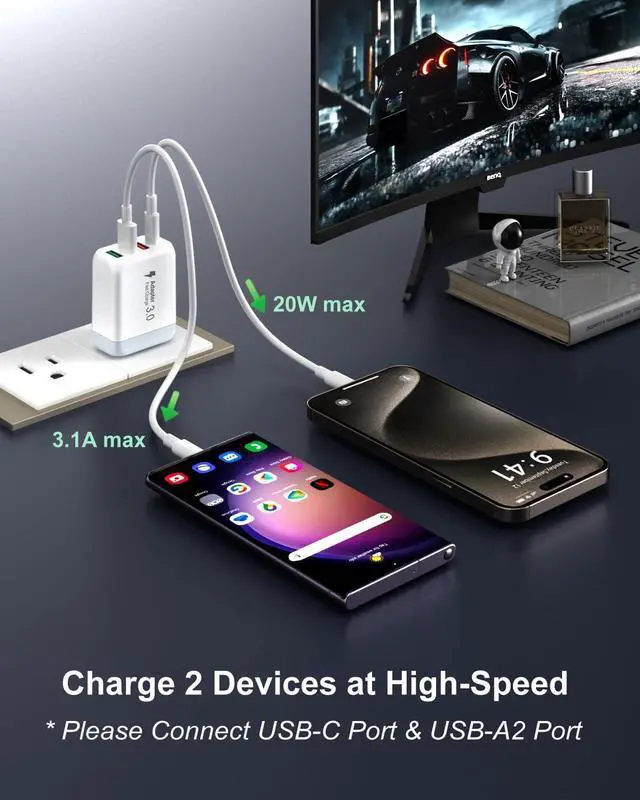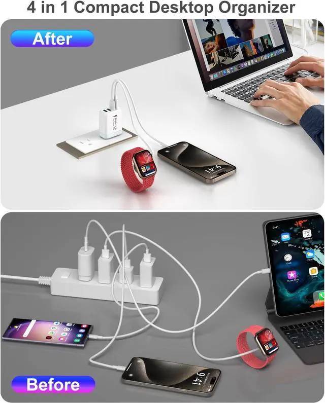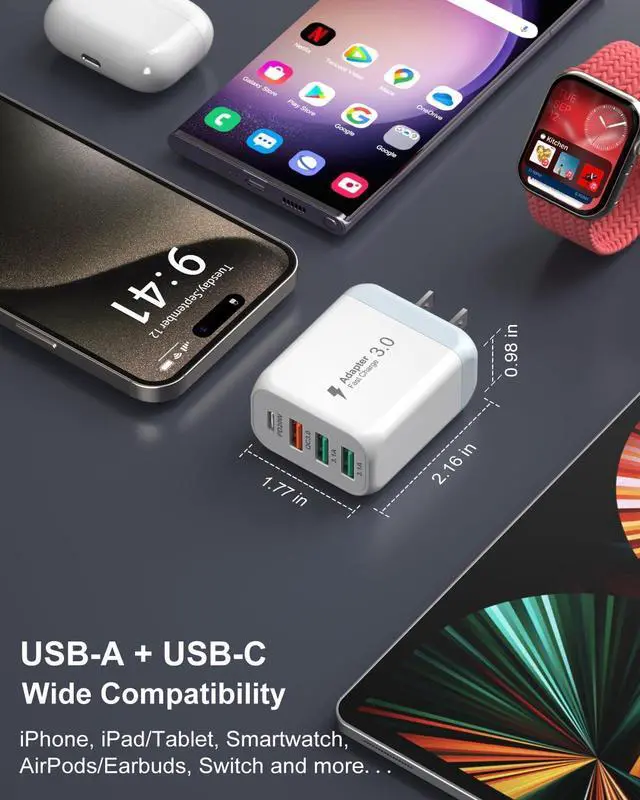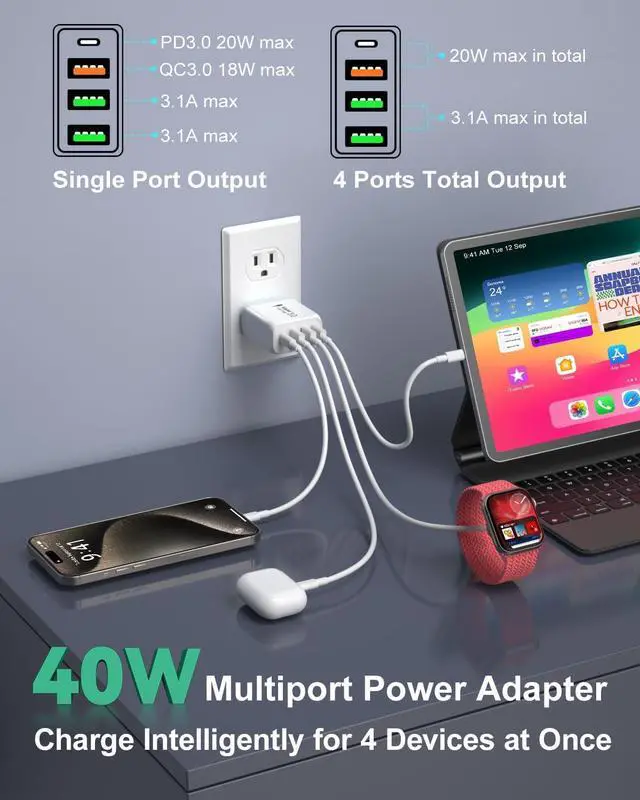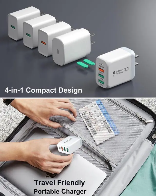 Portable Power Adapter: 1 charger for 4 devices no need to bring several wall adapters save space for you bag. Lightweight and pocket-friendly body with multi USB ports design is convenient to carry and keep during business trips/vacations. USB-C +