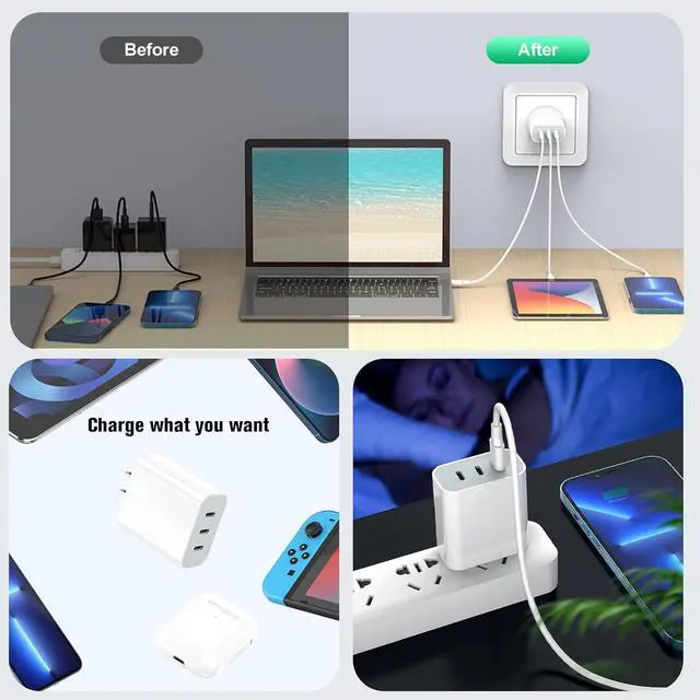 3-Ports USB C Chargers -- This usbc charging block is equipped with 3 USB-C ports to allow you to charge 3 devices at the same time. Please use with