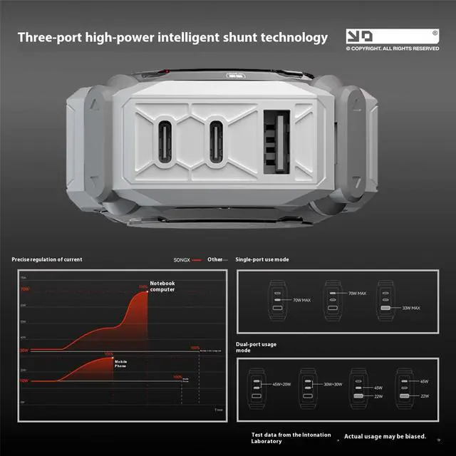 3-port intelligent power distribution design, single-port output up to 70W, dual/triple-port power allocation on demand, supporting simultaneous charging of multi-system devices without conflict.
