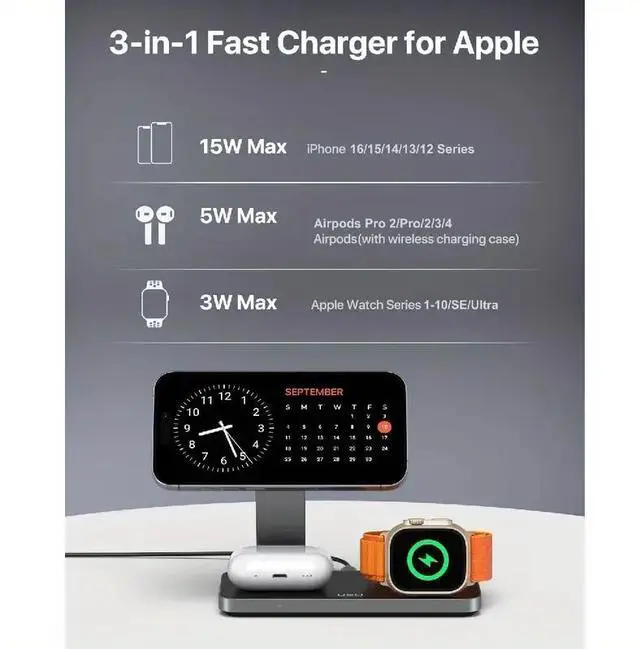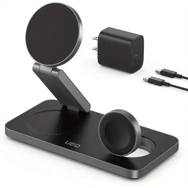 Upgrade your Apple charging experience with this foldable 3-in-1 MagSafe wireless charging station. Designed for ultimate convenience, this portable charger stand supports fast wireless charging for your iPhone 16/15/14/13/12 series, Apple Watch Ultra/SE, and AirPods Pro—all at once. The MagSafe charging station features strong magnetic alignment for secure attachment and efficient power transfer. Its sleek, compact design makes it ideal for both home and travel use. Whether you're looking for an iPhone MagSafe charger, a reliable Apple Watch charger, or a multifunctional wireless charging dock, this 3-in-1 magnetic charging stand is your all-in-one power solution.
