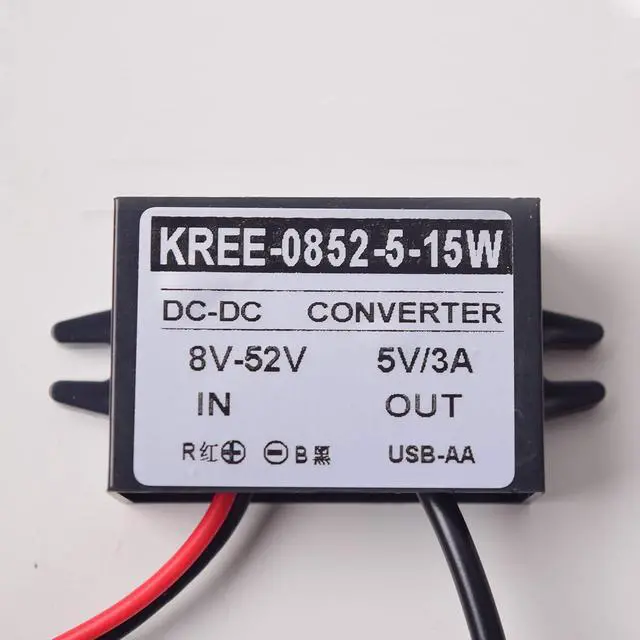 Super-thin, small size, high efficiency, easy installation and use. Input voltage: DC 12V, Output voltage: DC 5V, Max Output Current: 3A, Power: 15W.