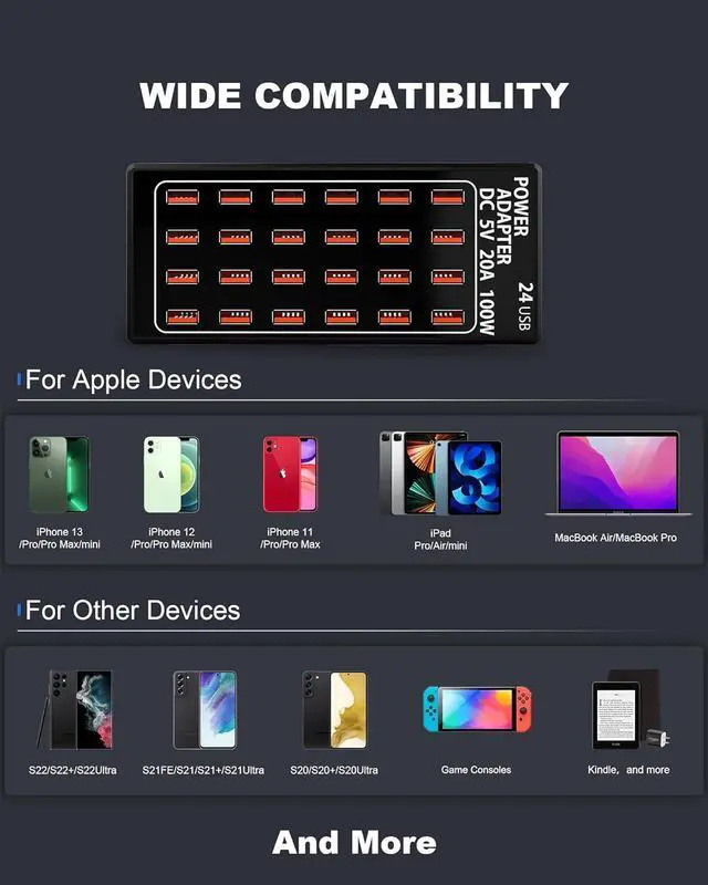 24 Port Charging StationRUANSZZ USB charging Station has 24 USB ports enabling simultaneous multi-device charging. 100W/20A usb charger stationEach port max 2.4AP rovides safe and fast charging for your devices