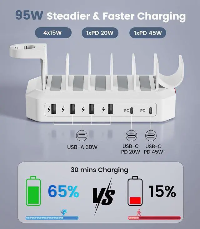Real Fast Charging StationWith a maximum of 65W power while a single USB-C port used, this multiple usb charging station can charge laptops like MacBook Pro/Air and ThinkPad to 100% in about 90 minutes. And when both USB-C ports are used simultaneously, you can charge up the phone and laptop quickly and at the same time. Fully charged devices is always available, greatly improving efficiency