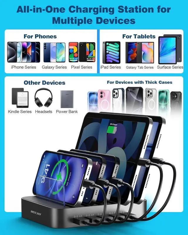 Universal Compatibility The charging station comes with 7 cables that can designed for your lphone 16 Series, 15, 15Pro, 14, 14Pro, 13, 13Pro, 12, 11, 11Pro, XS, XS Max, XR, X, SE, 8, 8 Plus, 7, 7 Plus, Ipads, Samsung Galaxy 23 / 22 / 21 Series, tablets and other electronics. USB-A charging station with 3 ios cables, 2 micro-usb cables and 2 usb-c cables.