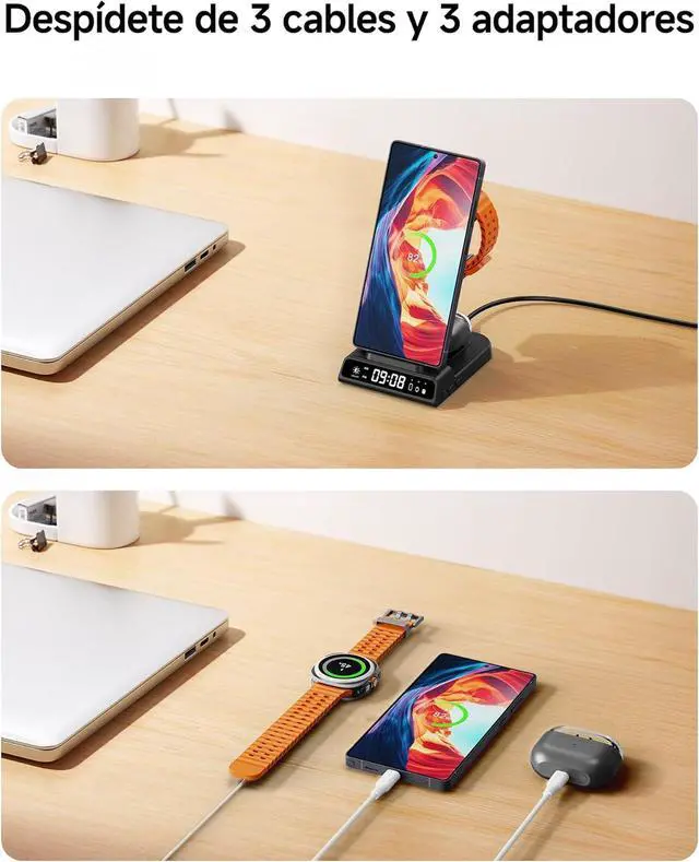 Space-Saving Design - This thoughtfully designed 3-in-1 charging station with a clock eliminates excess charging cables and desktop clocks. With just one device, you can charge multiple devices simultaneously and check the time without needing to unlock your phone.
