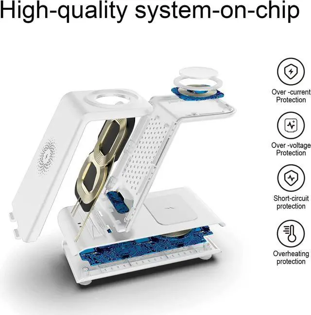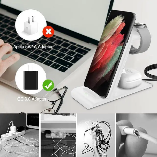 [Safety Charging] Our wireless charger station with smart chip can disconnect automatically after fully charged, to prevent over-charging and damage equipment and battery. Over-current, over-voltage, over-temperature protection system as well as foreign object detection function and the base back with venting holes ensure safe charging. The cargador inalambrico samsung package includes 1* 3 in 1 Wireless Charging Stand, 1* Type-C Power Cable, 1*QC 3.0 AC Adapter, 1*User Guide.