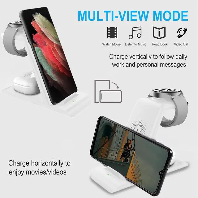 [COMPATIBLE MODES] The wireless charger station charge phone with case (up to 3mm), magnet, metal, card may prevent charging. 10W fast charging wireless for Galaxy S25 Edge, Galaxy S25 Ultra/S25, Galaxy S24/S23 /S22/S21/S20/S10/+/S9/S8, Note 20/Note10/9, Galaxy Z Fold 7/6/5/4/3, Flip7/6/5/4/3/Flip, iPhone 16/15, 14, 13, 12 etc, 7.5W for iPhone 11 Pro Max/XS MAX/XR/X/8 plus. 5W for galaxy watch 7/6/5/4/ watch 3/Active 1 2 40/44mm, Galaxy Buds3/2 Pro, Buds3/2, buds live/Pro and multiple android accessories.