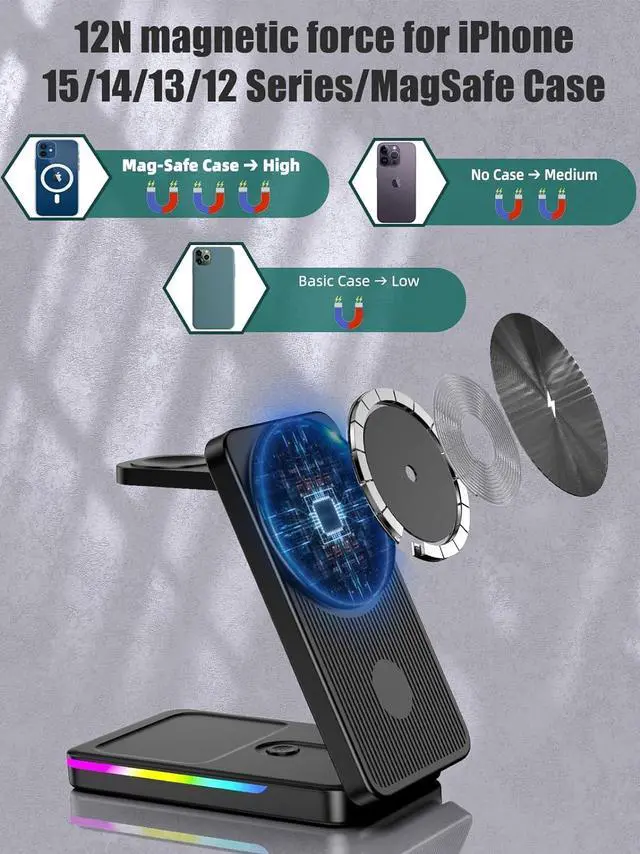 Multi-Device Charging - This 3 in 1 wireless charging station compatible with iPhone 16/15/14 Pro Max/14Pro/14Plus/14/iPhone 13/13 Pro/13 Pro Max/13 Mini/iPhone 12/12 Pro/12 Pro Max/12 Mini; AirP ods Pro 2/3/Pro/Galaxy Buds 2 Pro/2/Pro/live/ iWatch Series 8/7/6/ 5/4/3/2/1/SE only.
