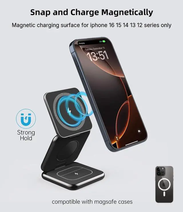 Strong Magnetic Wireless Charging: Built-in high-quality magnets to hold iPhone precisely in the best charging position and lock automatically. Built-in 3 coils wide charging area to bring you a fast and stable wireless charging experience. Put your iPhone onto the device horizontally or vertically to get it charged instantly. Compatible with iPhone 16/15/14/13/12 series (Please work without cases, or use magnetic cases)