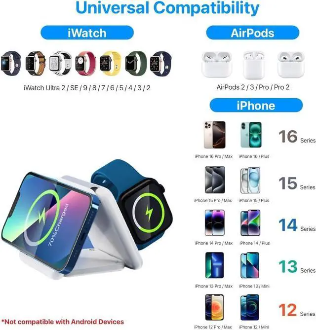 Wide CompatibilityCompatible with iPhone 12/13/14/15/16 series. iWatch Series 2, 3, 4, 5, SE, 6, 7, 8, Ultra (Not support for Samsung watch). AirPods Pro/Pro2, AirPods 2/3 (Not support for AirPods 1).