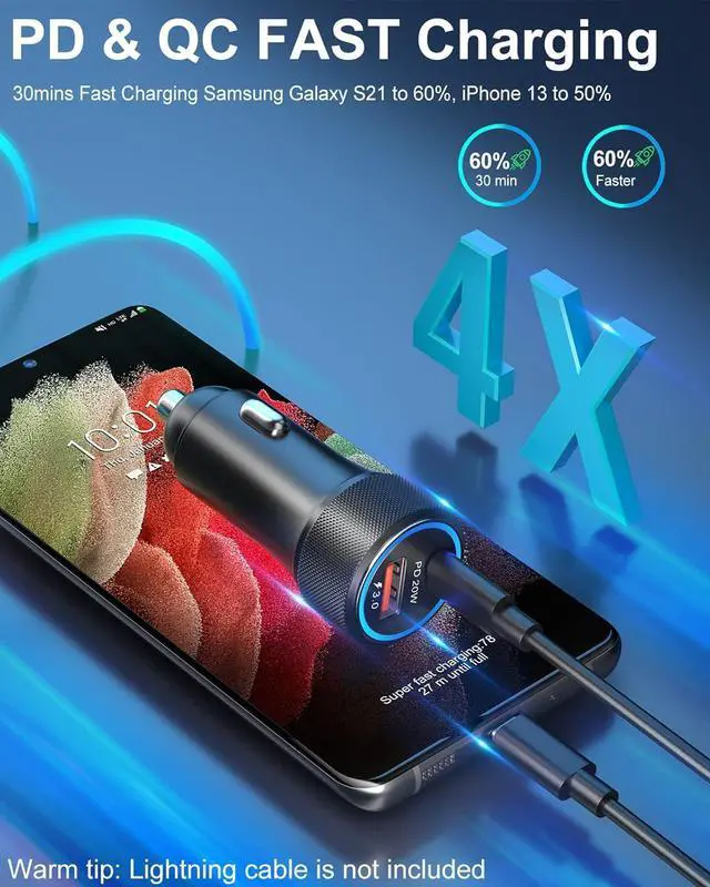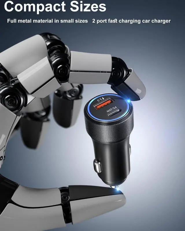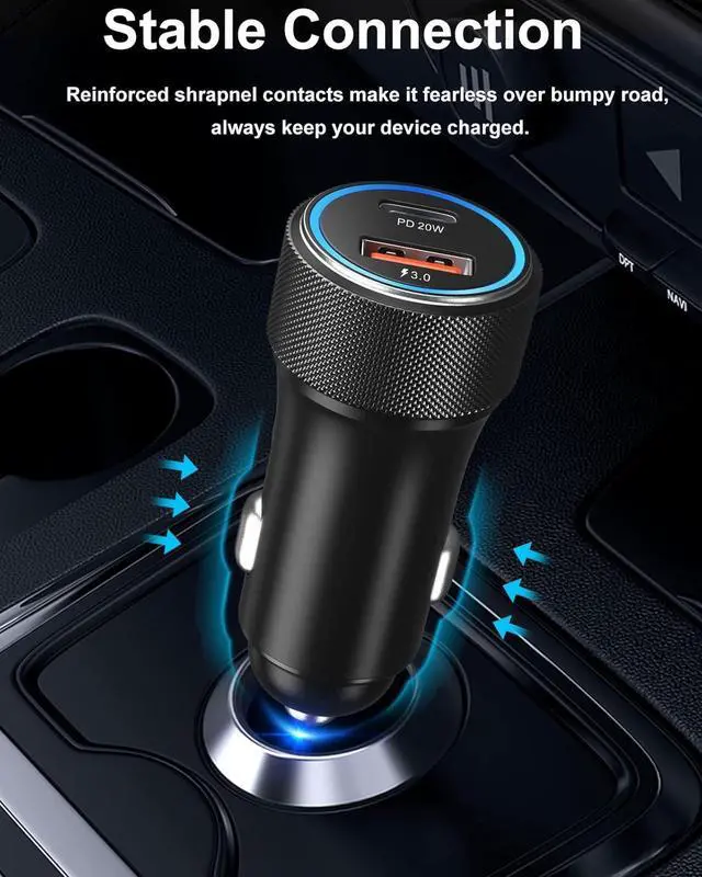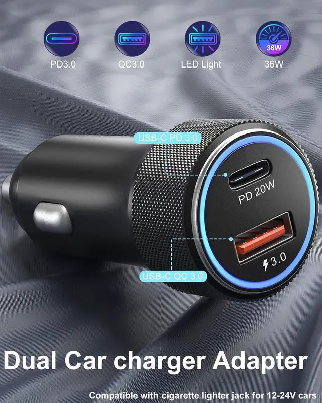 Handy Car Charger AdapterElegant full aluminium alloy body provides netter scratch resistance and less heat performance. Type C fast car charger works with soft blue LED light, helps you locate and charge easily at night or in the dark. Compact and lightweight body keeps the car charger sit tightly in the most car cigarette lighter.