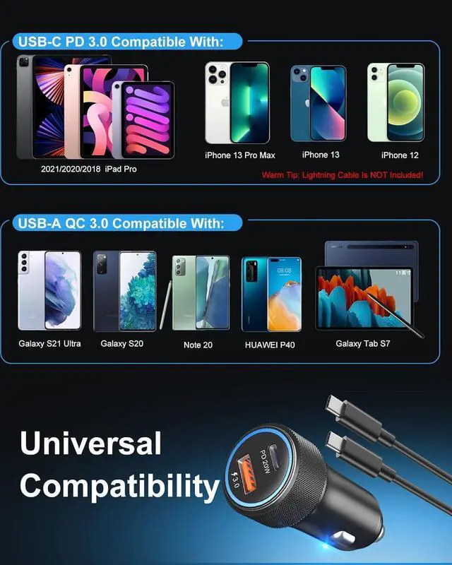 Wide Compatibility of Dual Car Charger Equipped with USB A 3.0 + USB C 3.0 fast charging technology, provide fast charging experience in your every driving trip. Perfectly fit for iPhone 16/16 Plus/16 Pro/16 Pro max/iPhone 15 pro max plus iPhone 14/14 Plus/14 Pro Max/13/13 Mini/13 Pro/13 Pro Max/12/12 Mini/12 Pro/12 Pro Max/11/Pro/Max/iPhone X/XS/XR/8/8 Plus/SE, Smartphones, Samsung S24/S23/S22 Ultra/S21, Note 20/20Ultra Pixel 5a/5/4/4a/4XL/3a/3XL/2/2XL, LG8/G7/G6/G5, V50/V40/V35/V30, and more