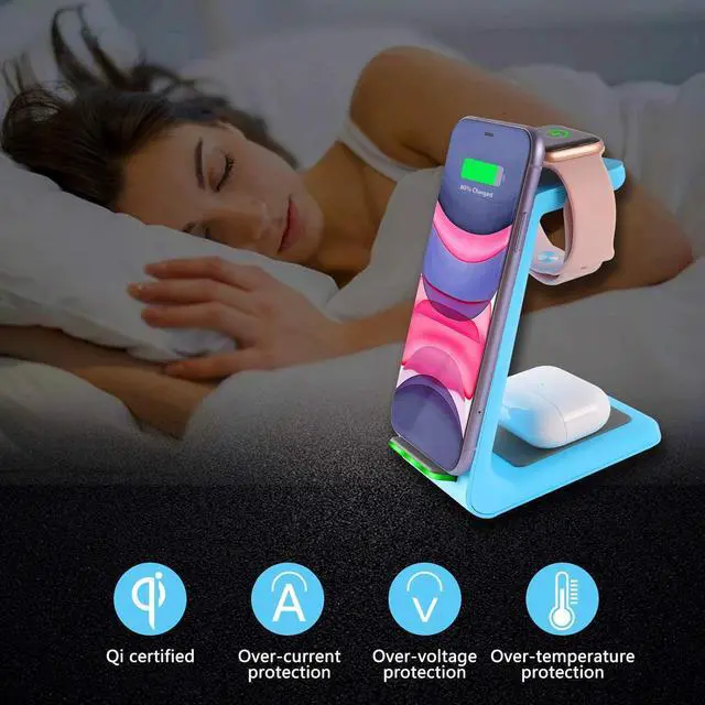 Sleep-Friendly DesignThe green light will be on when your Qi-Enabled phone/iWatch/Airpods is charging, and it will automatically go out after the 20s. And the base is coated with silicone throughout the body to fully prevent the device from offset and sliding, ensuring stable charging.