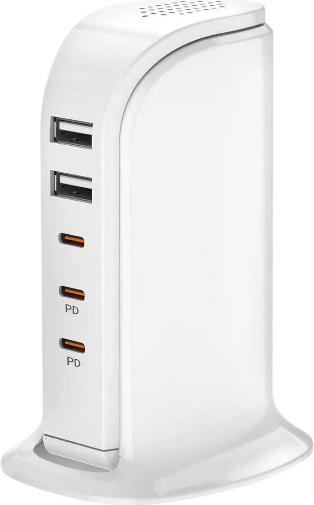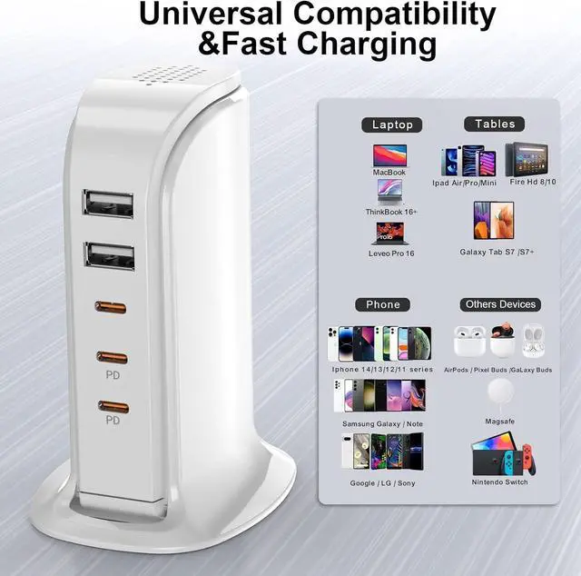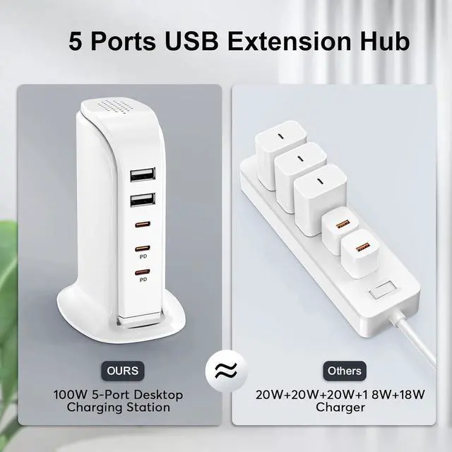 Efficient Charging: With 2 USB + 3 type c ports and a total power output of 100W, our USB tower charger allows you to charge multiple devices simultaneously, saving you time and hassle.