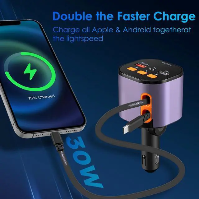 PD Retractable Cables - To enhance your driving experience, our fm transmitter includes a 30 W USB C and a 12 W USB iPhone retractable cable, eliminating the need for extra cords and effortlessly charging for both Apple and Android devices. The retractable cables of car charger extend up to 80cm and retract smoothly for a tidy car interior