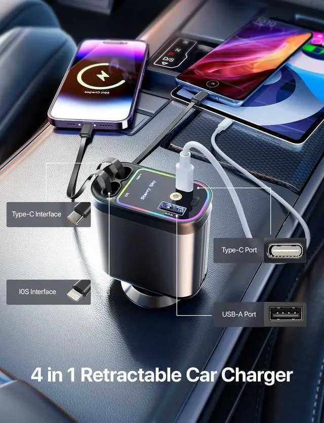 • 4 in 1 Car Charger: With two retractable type-C cables, USB-C and USB-A ports, this fast charging car charger supports fast charging for up to four devices simultaneously. Retractable Phone Car Charger features an ingenious Tangle-Free retractable cable design that keeps your charging cables organized and ready for use.