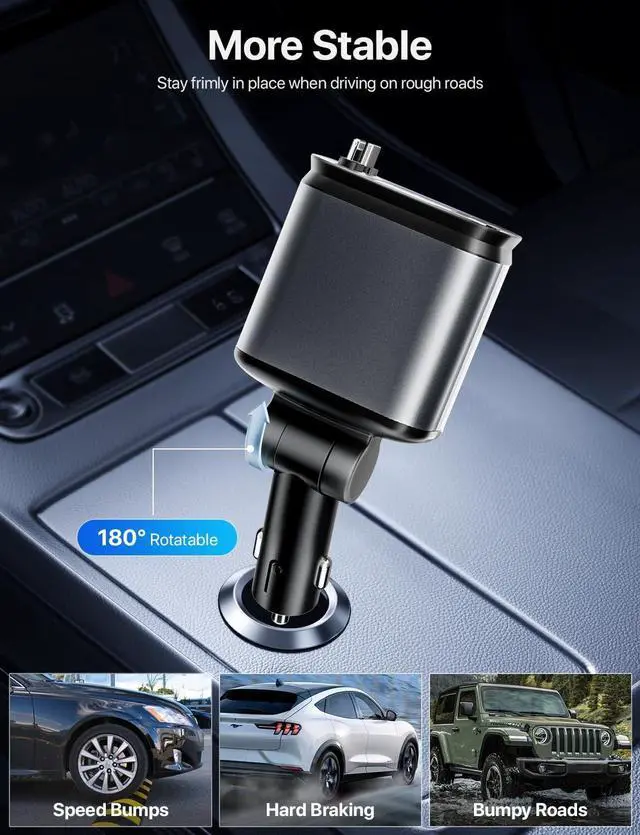 Adjustable 180 Degree Charging Plug: This retractable phone charger for car can freely rotate 180 degrees, combined with stronger bottom clasp, effortlessly stay firmly even when driving through bumpy roads