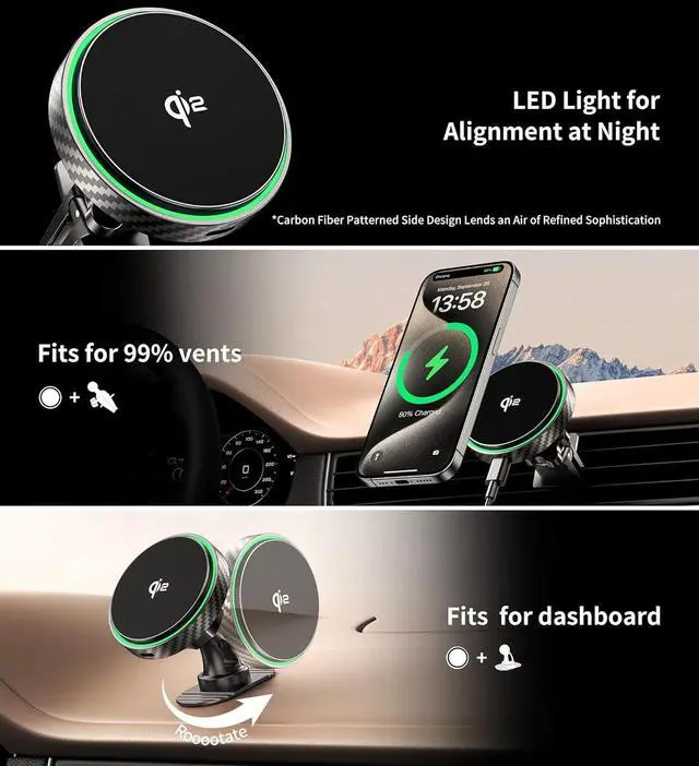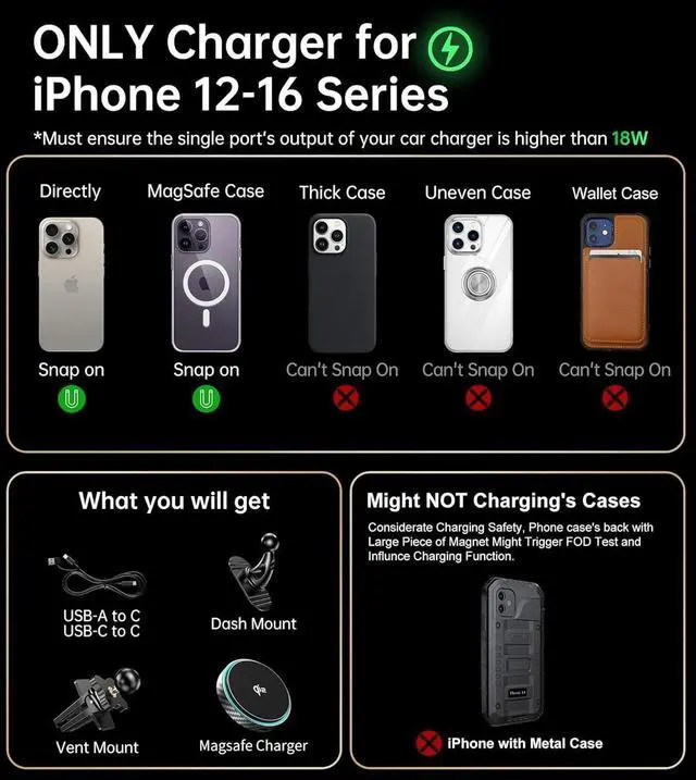 Compatitable Phone Model: This magsafe car mount charger designs for (1) iPhone 12-16 Series Directly without case (2) iPhone 12-16 Series with magsafe case (3) iPhone 12-16 Series with the circle magsafe ring.