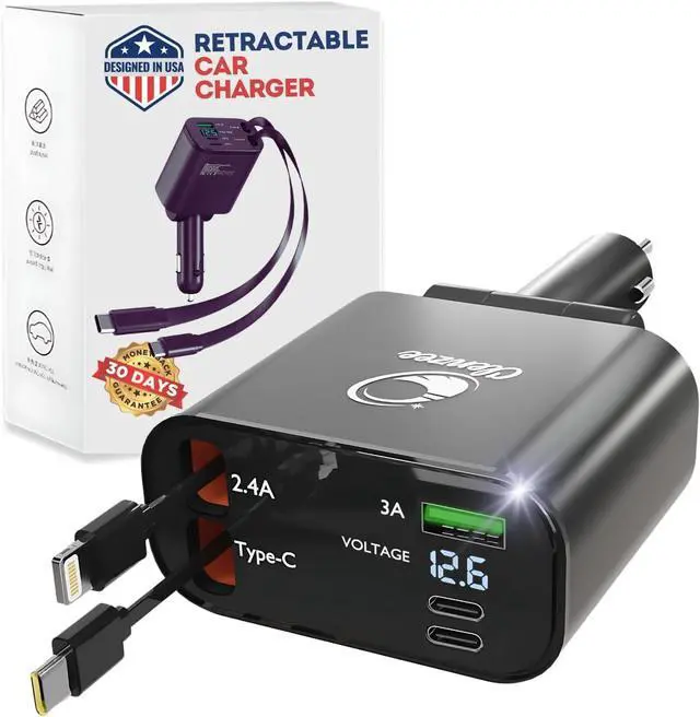 RETRACTABLE CONVENIENCEKeep your car tidy with this car charger with two retractable cords. The retractable car phone charger features a compact design that neatly tucks away when not in use for a sleek look.