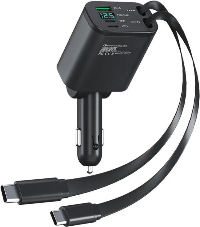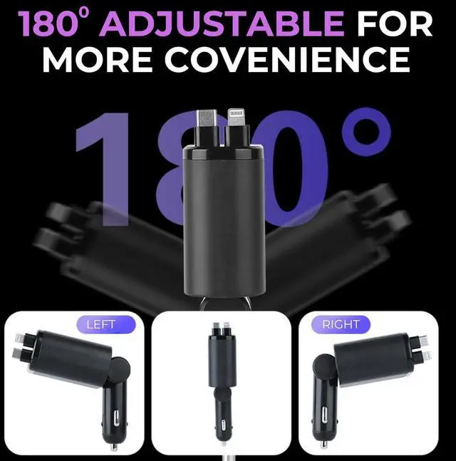 5 IN 1 66W FAST CHARGINGThis car charger with two retractable cords delivers 66W output to rapidly power up to 5 devices simultaneously. The retractable iPhone charger for car features smart IC tech to optimize charging speed for each connected device.